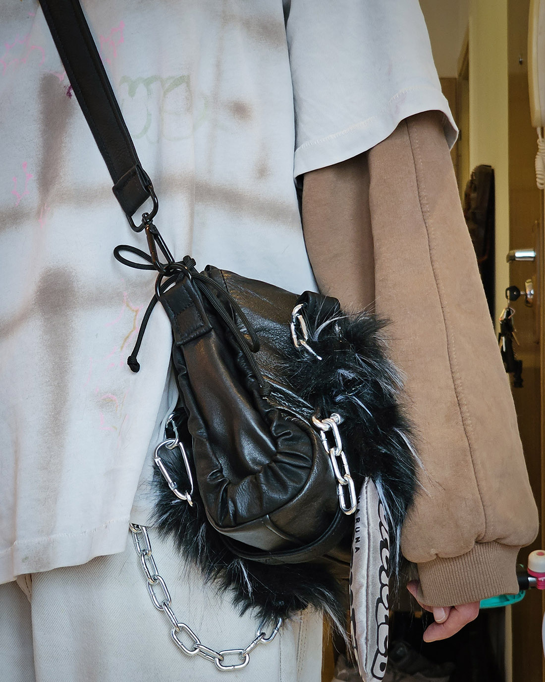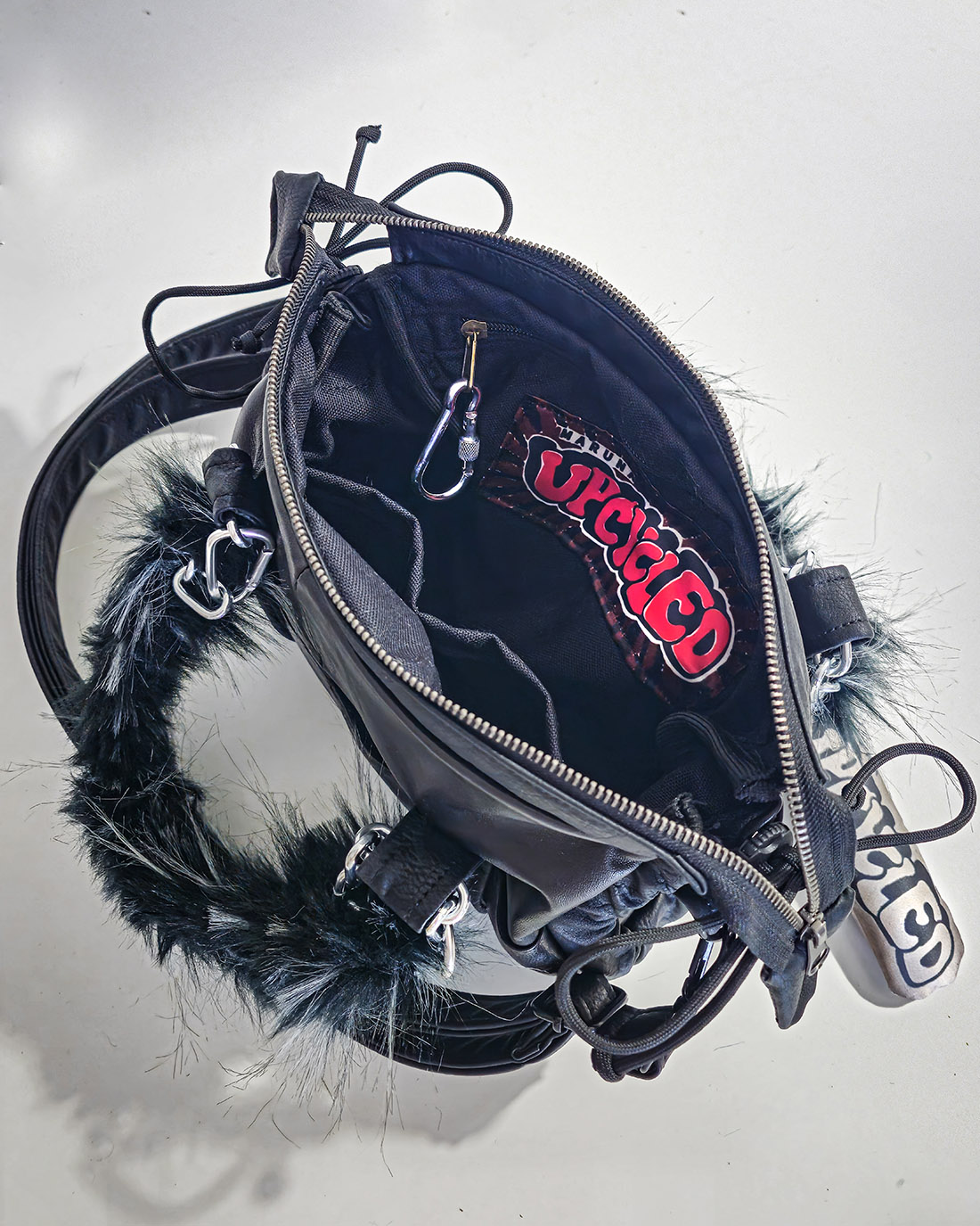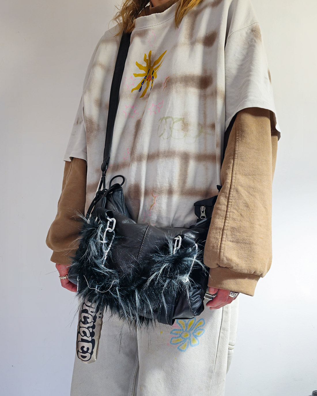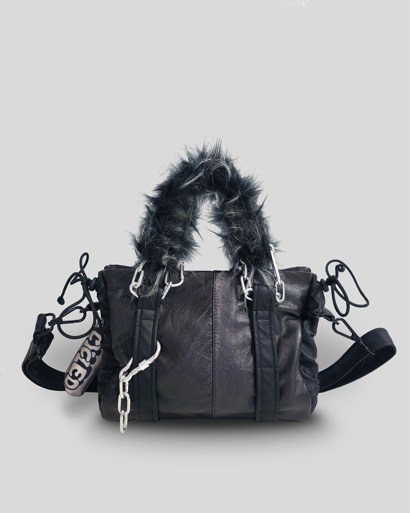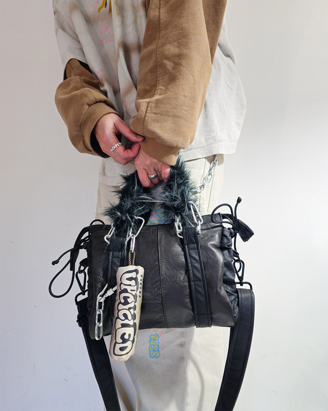 Mała torebka Mini Grunerlokka. Uszyta z sórzanych kurtek i płaszczy. Torebka zaprojektowana w taki sposób, że przy pomocy linek można regulować jej wielkość i kształt.