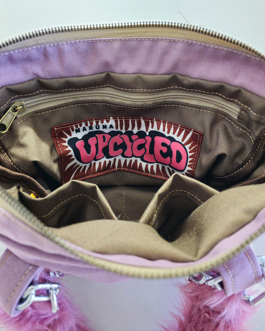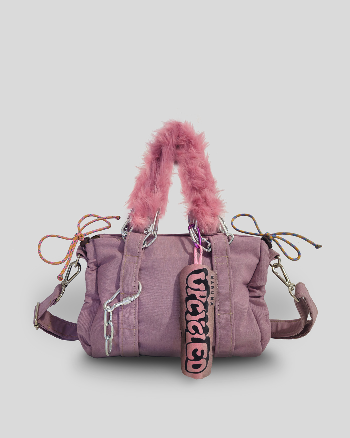Mała torebka Mini Grunerlokka. Uszyta z deadstockowego drelichu i futrzanych kurtek . Torebka zaprojektowana w taki sposób, że przy pomocy linek można regulować jej wielkość i kształt.