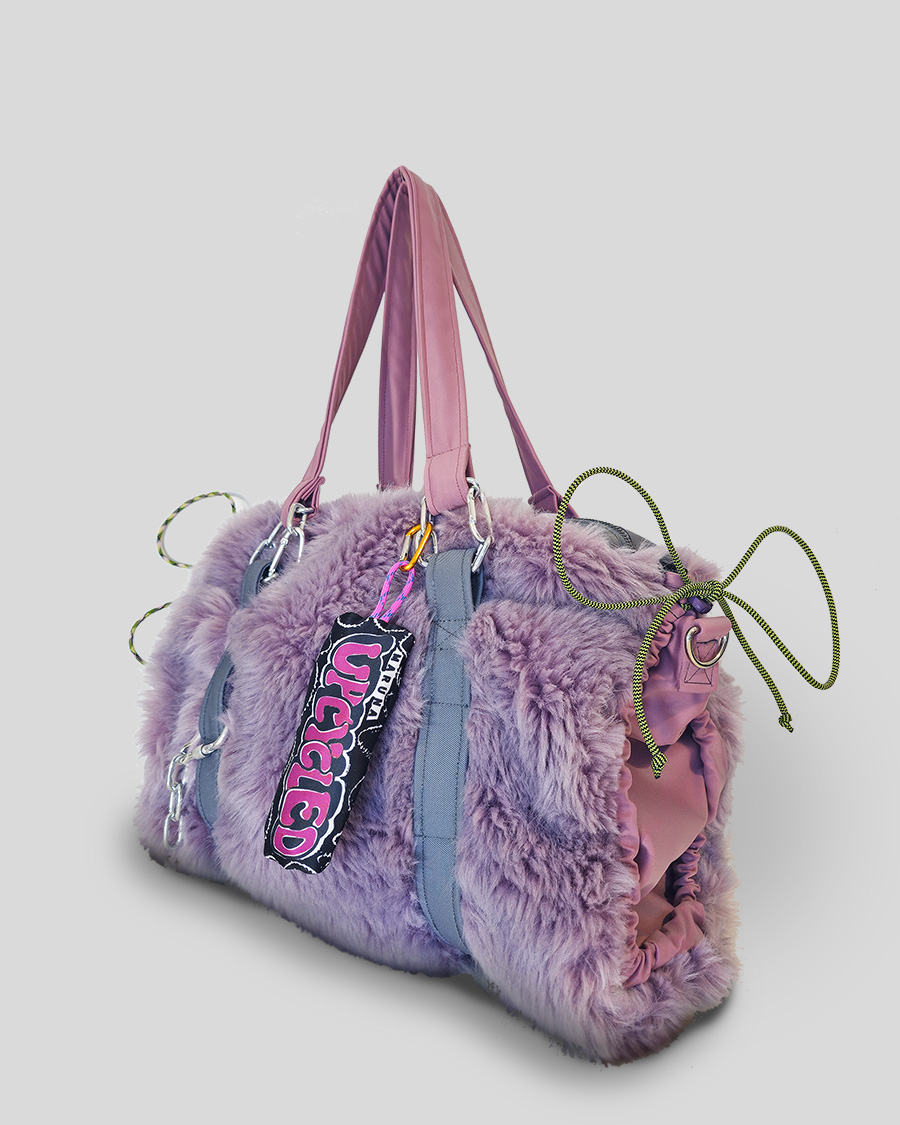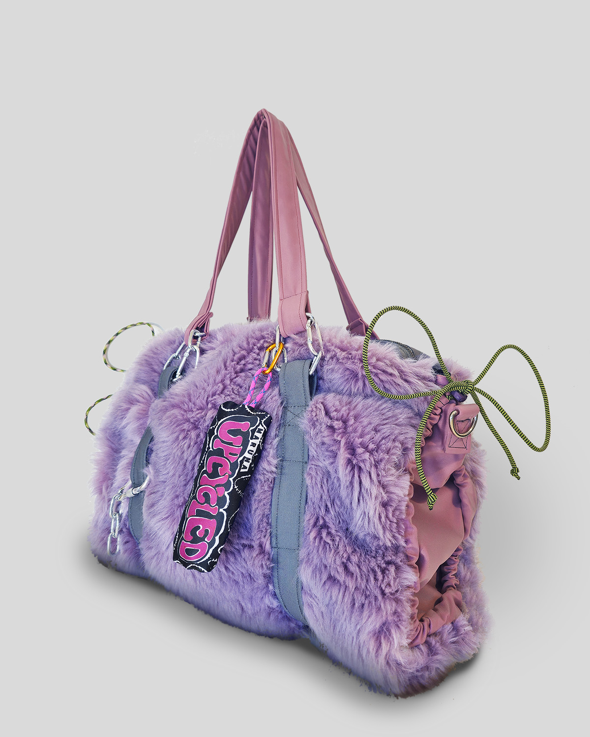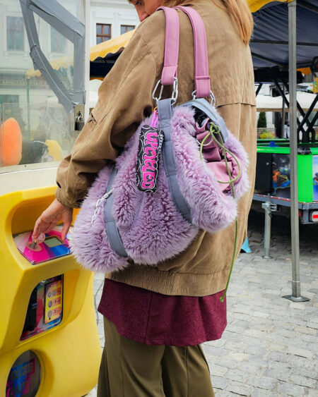 Średniej wielkości torebka na ramię Grunerlokka. Uszyta z deadstockowego sztucznego futra. Torebka zaprojektowana w taki sposób, że przy pomocy linek można regulować jej wielkość i kształt.