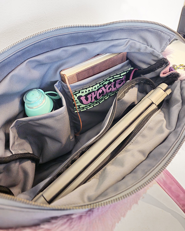 Torba zamykana na zamek.  W środku podszewka z dwoma otwartymi kieszeniami oraz dużą kieszenią na laptopa zapinaną na zamek. Torebka posiada w środku linkę z karabińczykiem do przypięcia kluczy. Odpinany pluszowy brelok z logo.