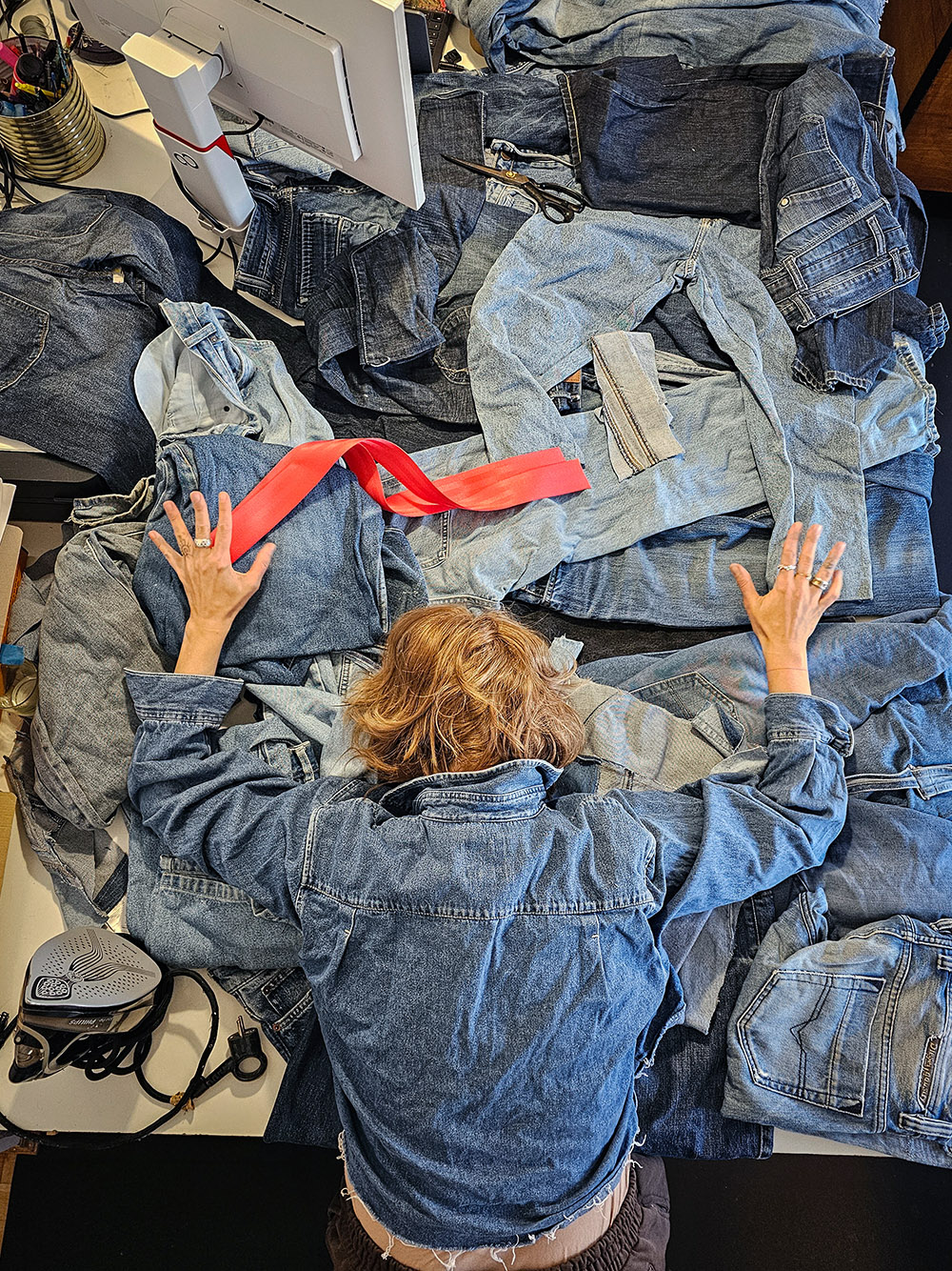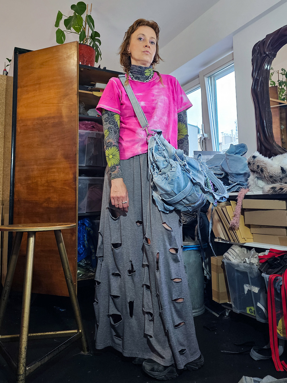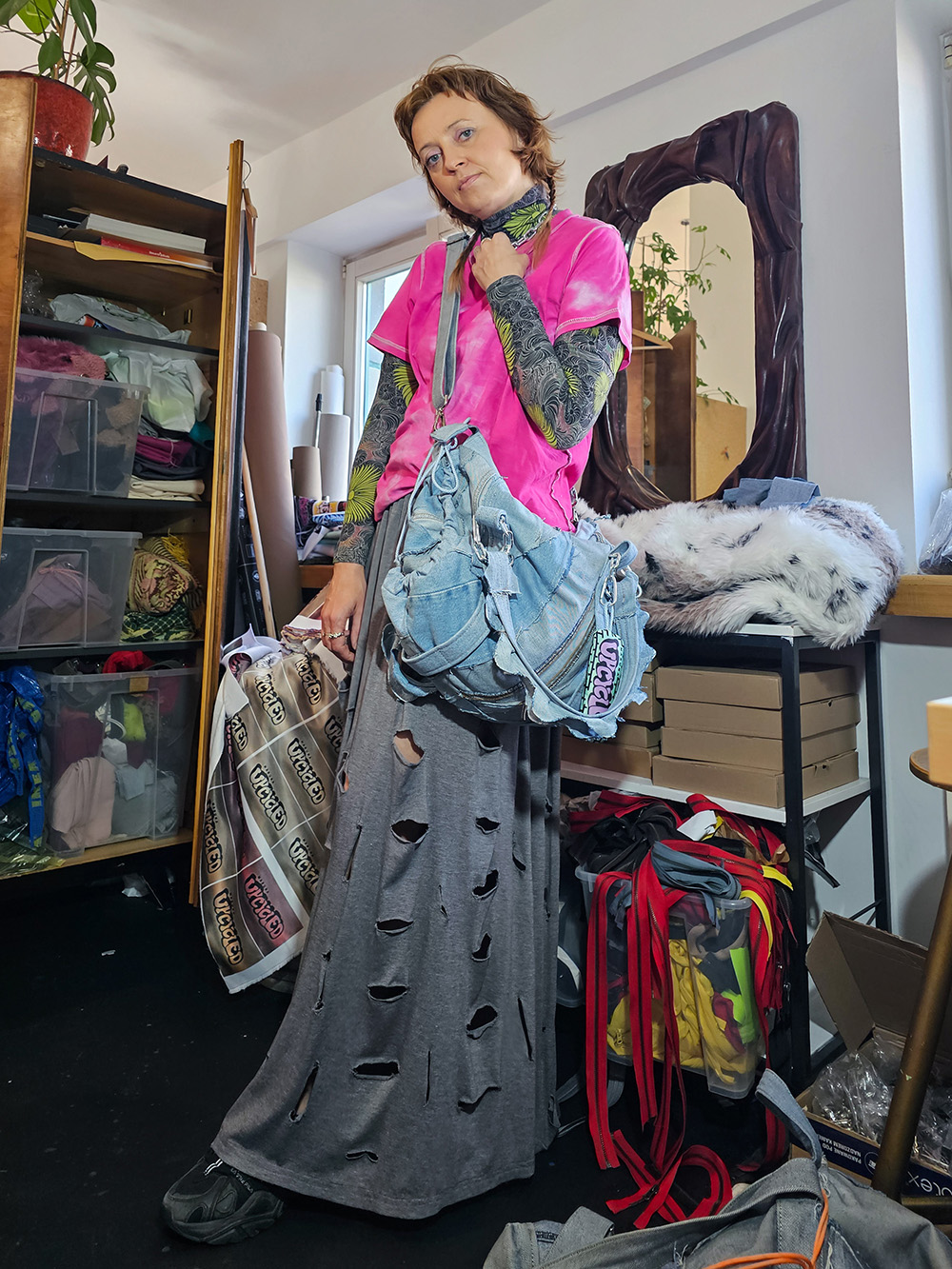 Średniej wielkości torebka na ramię Grunerlokka. Uszyta z jeansowych spodni. Torebka zaprojektowana w taki sposób, że przy pomocy linek można regulować jej wielkość i kształt.