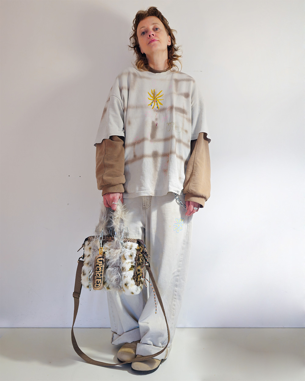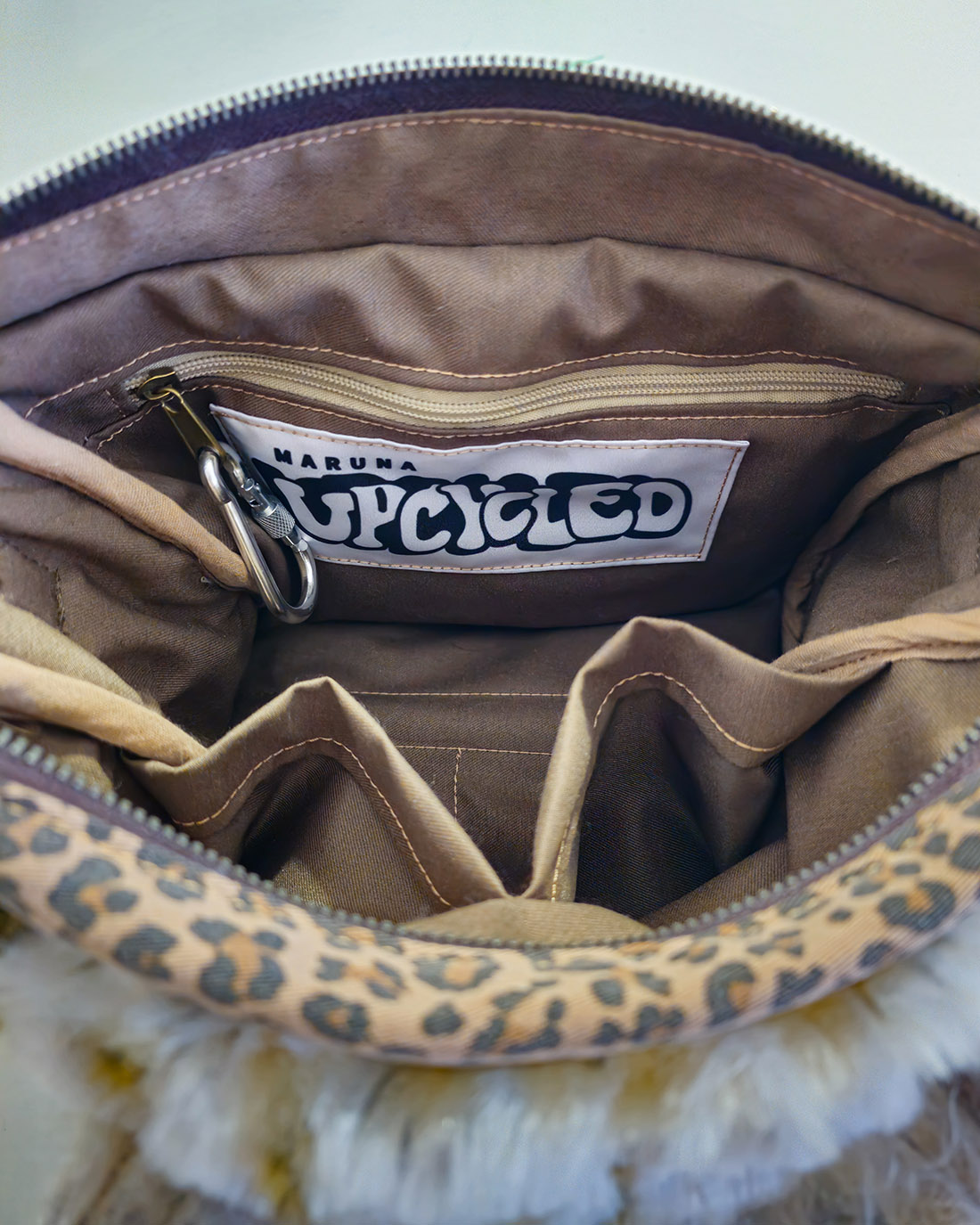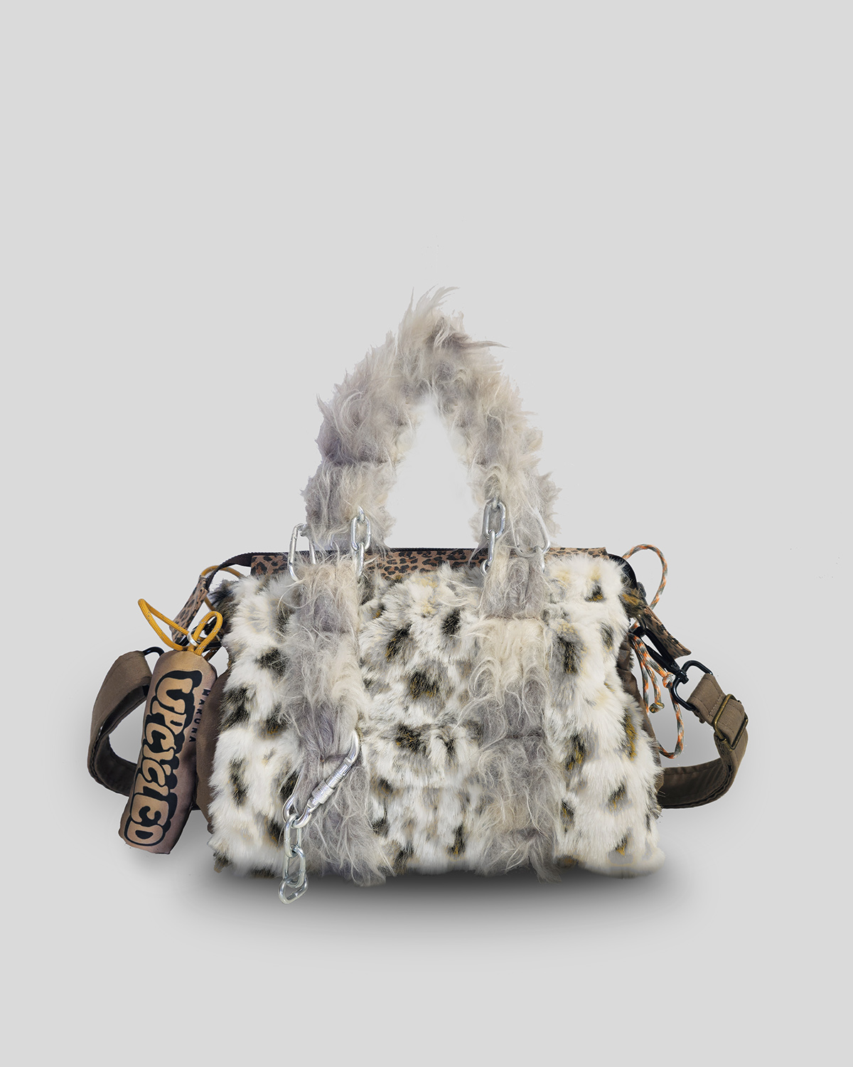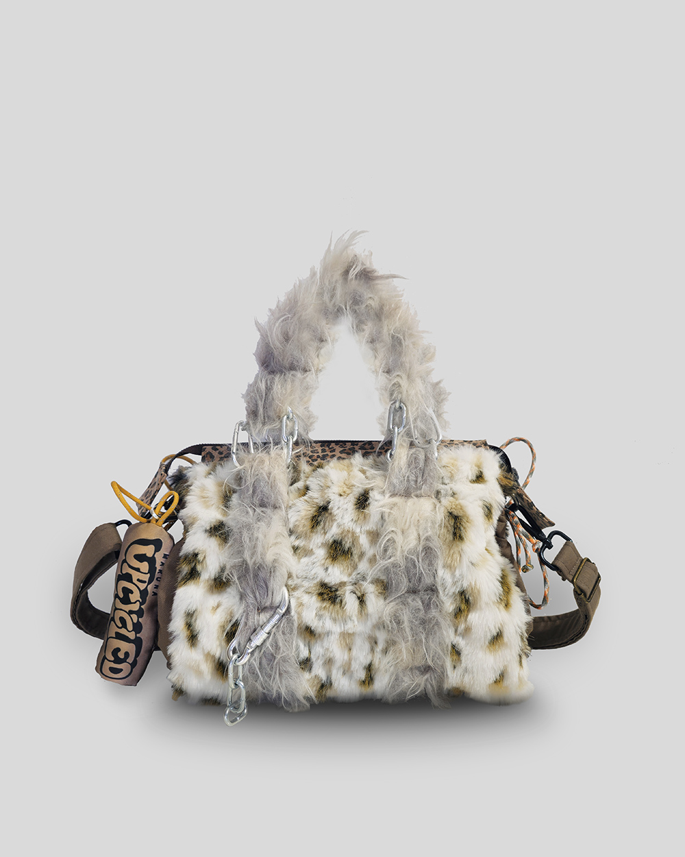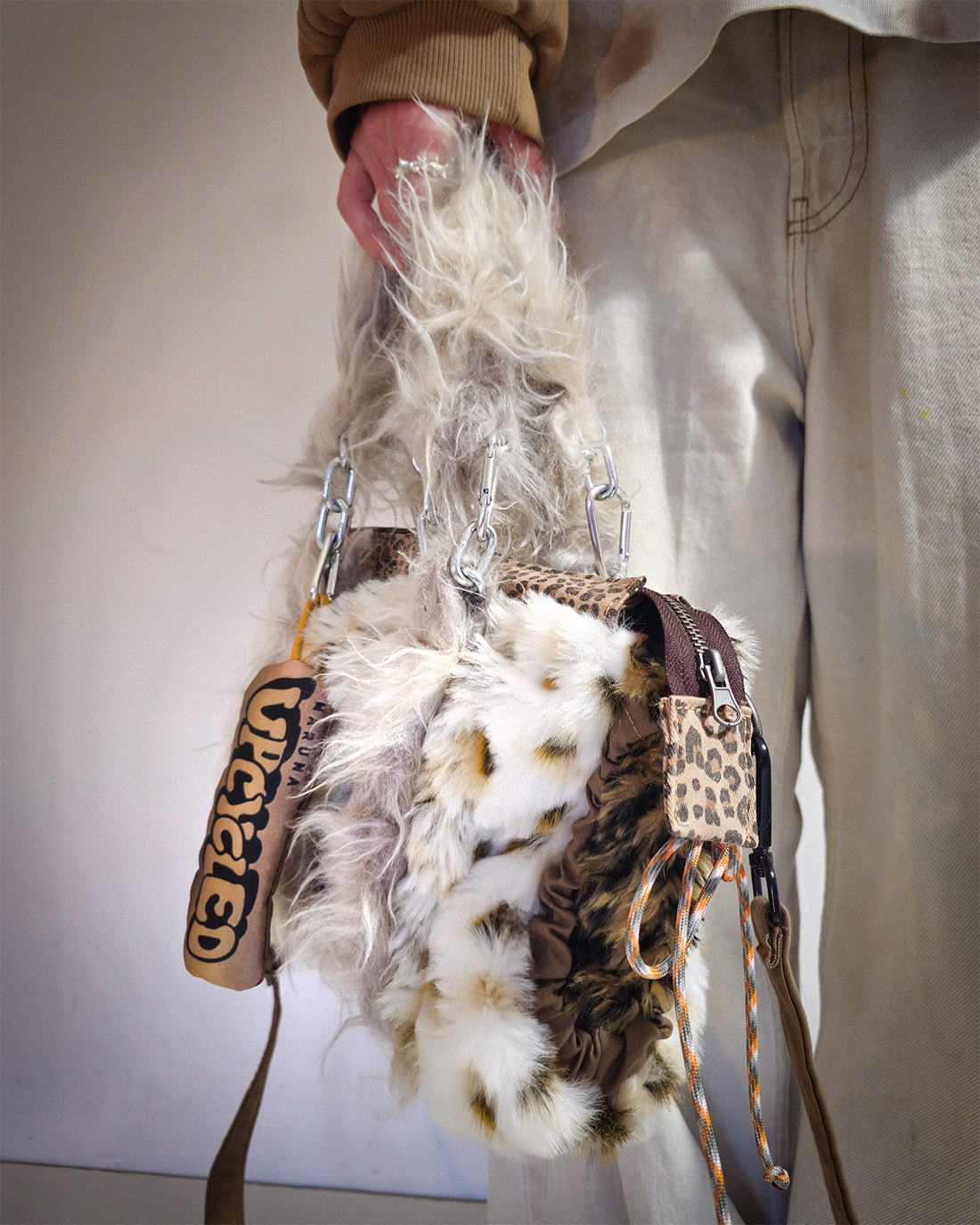 Mała torebka Mini Grunerlokka. Uszyta z futrzanych kurtek i płaszczy. Torebka zaprojektowana w taki sposób, że przy pomocy linek można regulować jej wielkość i kształt.